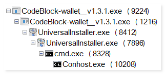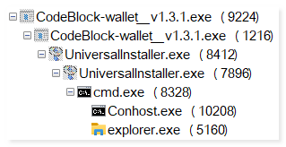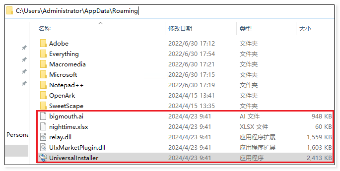 CodeBlock-wallet_v1.3.1-1.bin 是 Payload 的源文件,样本分段读取并解密 CodeBlock-wallet_v1.3.1-1.bin 的内容后,在 C:\Users\Administrator\AppData\Roaming 目录下先以xxxx.tmp 的形式释放,再重命名为 bigmouth.ai、nighttime.xlsx、relay.dll、UIxMarketPlugin.dll、UniversalInstaller.exe,随后执行 UniversalInstaller.exe 开启下一阶段流程: