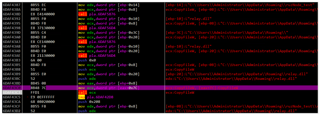 pla.dll 中注入的解密代码会读取前面数据区中的 ruzNode_test 字符串用于在 C:\Users\Administrator\AppData\Roaming 目录下创建备份文件夹,然后调用 CopyFileW 函数将原先释放的 bigmouth.ai、nighttime.xlsx、relay.dll、UIxMarketPlugin.dll、UniversalInstaller.exe 复制过来作为备份: