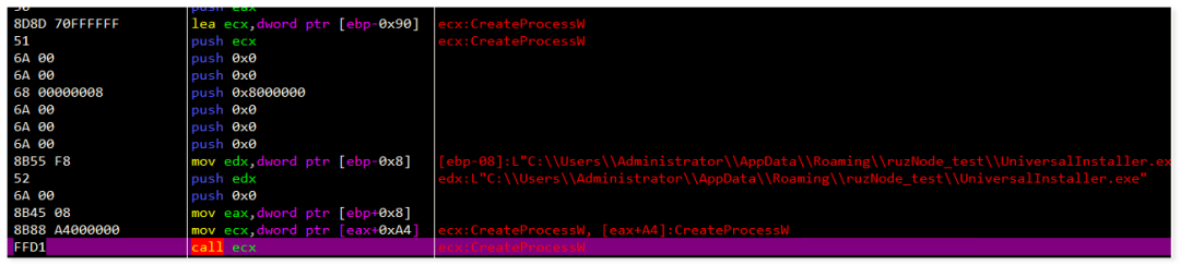 随后创建以 C:\Users\Administrator\AppData\Roaming\ruzNode_test 目录下的 UniversalInstaller.exe 为主体的执行进程替换 C:\Users\Administrator\AppData\Roaming 目录下的 UniversalInstaller.exe 以执行后续操作: