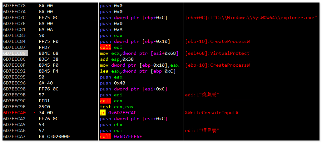 最后创建 "C:\Windows\SysWOW64\explorer.exe" 进程,以同样的方式将解密的 EXE 文件以远程线程的方式注入进去: