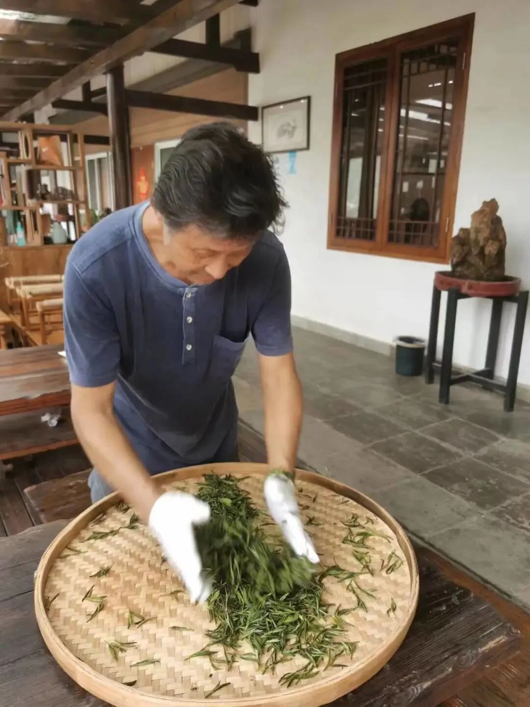 所以“要传统也要创新”也是制茶人老朱给自己做紫笋定的标准。老朱全名朱锁芳,是一位60后的宝物猎人。他向自己的前辈陆羽取经,曾走访云南、福建、潮汕、安徽等地,足迹几乎遍布所有茶产区;和陆羽一样,他2014年刚一退休便在顾渚山留了下来,整日种茶,做茶,一趟又一趟地往返在这里的林崖小径上。