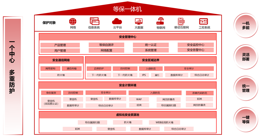 等保三级 | 安全管理平台系统模块 | 统一提供等保一体机底层基础硬件平台、安全虚拟化平台、安全资源池管理平台、安全模块。安全虚拟化平台实现等保一体机计算资源、存储资源、网络资源、网络功能资源、安全功能等IT基础资源的虚拟化,具有高可靠及高灵活性。 |