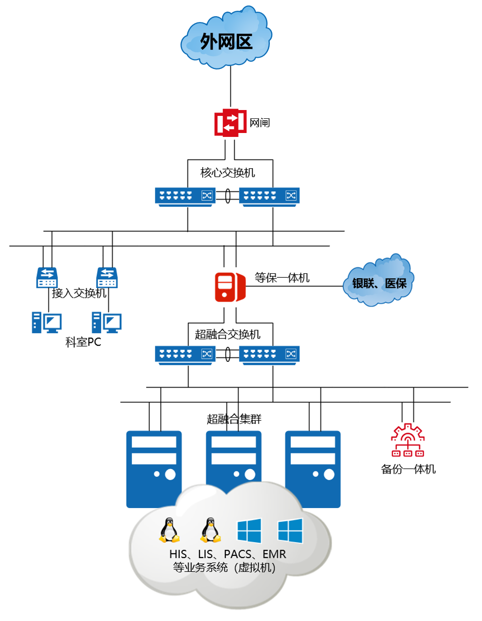 随着医疗信息化建设的快速推进,医院的日常运营已高度依赖各种信息系统,如医院信息系统(HIS)、实验室信息系统(LIS)、医学影像存档与通讯系统(PACS)和电子病历系统(EMR)等,这些系统产生的庞大数据对于医院的正常运转至关重要。同时,在网络安全威胁日益严峻的背景下,确保核心医疗应用的“连续性”和“数据完整性”成为医院信息化建设中首当其冲的关键任务。但对于二级医院,由于受限于业务规模,无法像三级医院投入过多预算以及技术人员以支撑复杂的信息化建设和运营,因此,打造一套轻量化、高效率、强可靠的信息化系统对于二级医院极为重要。