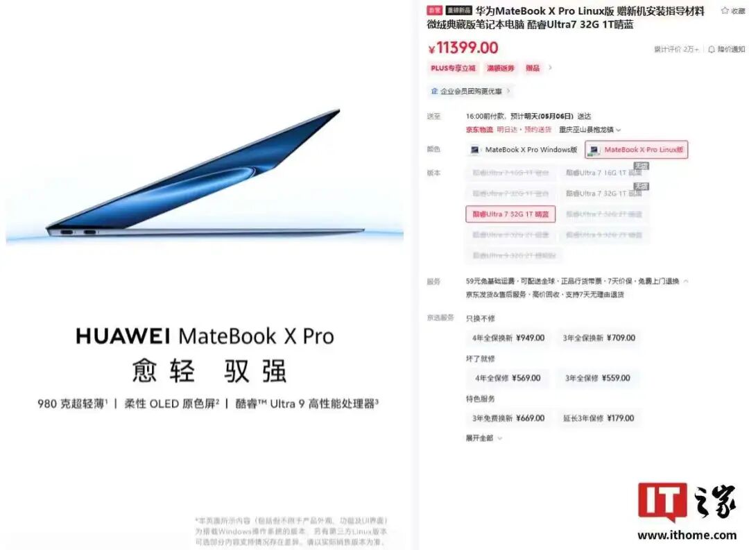 5 月 5 日消息,华为 MateBook X Pro 笔记本 Linux 版现上架京东开售,新品笔记本搭载酷睿 Ultra7 处理器、配备柔性 OLED 原色屏,定价 11399 元、国补价 9399 元(国补优惠 2000 元,当前仅「酷睿 Ultra7 + 32GB + 1TB 晴蓝」有货)。(来源:IT 之家)