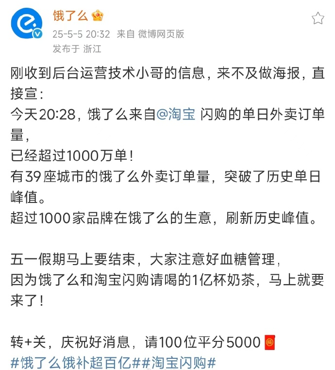 5 月 5 日消息,据饿了么官方披露,截至当日 20 时 28 分,淘宝闪购日订单已突破 1000 万单。