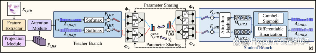 下图 c 展示了 DMIN 在高分辨率 WSI (Xᵢ,ₕᵣ) 上的自蒸馏训练。DMIN 由 5 个模块组成,包括 投射模块 (Projection Module)、注意力模块 (Attention module)、教师分支 (Teacher Branch)、学生分支 (Student Branch) 和 CKA分类器 (CKA classifiers)。