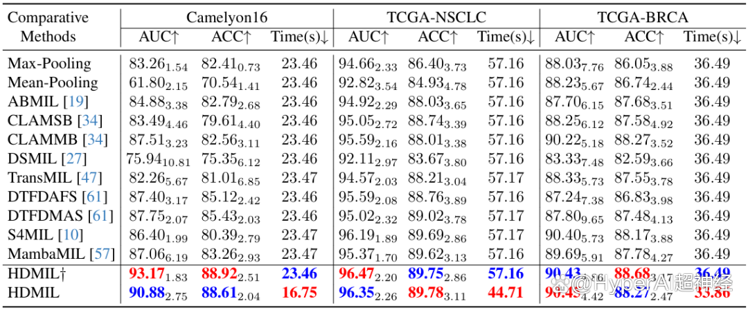 基于 Camelyon16、TCGA-NSCLC、TCGA-BRCA 三个数据集,研究人员将 HDMIL 与 11 种 MIL 方法进行了分类性能的对比,包括 Max-pooling、Mean-Pooling、ABMIL、CLAMSB、CLAMMB、DSMIL、TransMIL、DTFDAFS、DTFDMAS、S4MIL、MambaMIL。
