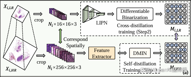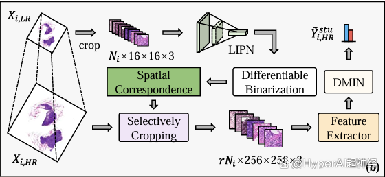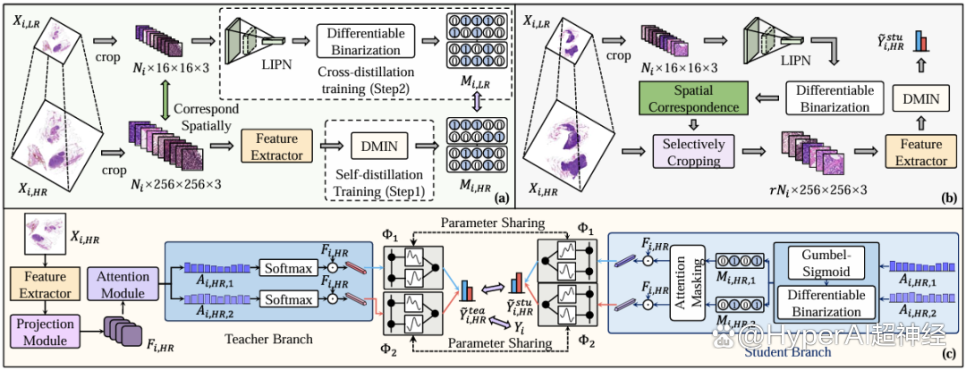 下图 b 所示为推理阶段,具体过程可以分为三步:第一步是裁剪低分辨率 WSI (Xᵢ,ₗᵣ) 中的所有 patch,总数为 Nᵢ;第二步是将这些 patch 输入到 LIPN,以识别与分类相关区域,生成 Mᵢ,ₗᵣ;第三步是基于 Mᵢ,ₗᵣ 有选择性地裁剪 Xᵢ,ₕᵣ 中相应的 patch,然后将剩余的 patch 输入到特征提取器和 DMIN 中,最后通过跨类别的学生分支分别计算,生成最终分类结果。