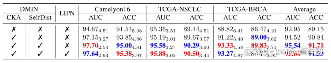 为了分析各成分的影响,研究人员进行了消融实验,对 HDMIL 中每个模块对分类结果的影响给出进一步说明,如下图所示。研究结果发现,通过提出的 CKA 分类器取代传统的基于线性层的分类器,并将自蒸馏纳入 DMIN 训练中,都显著提高了分类性能。