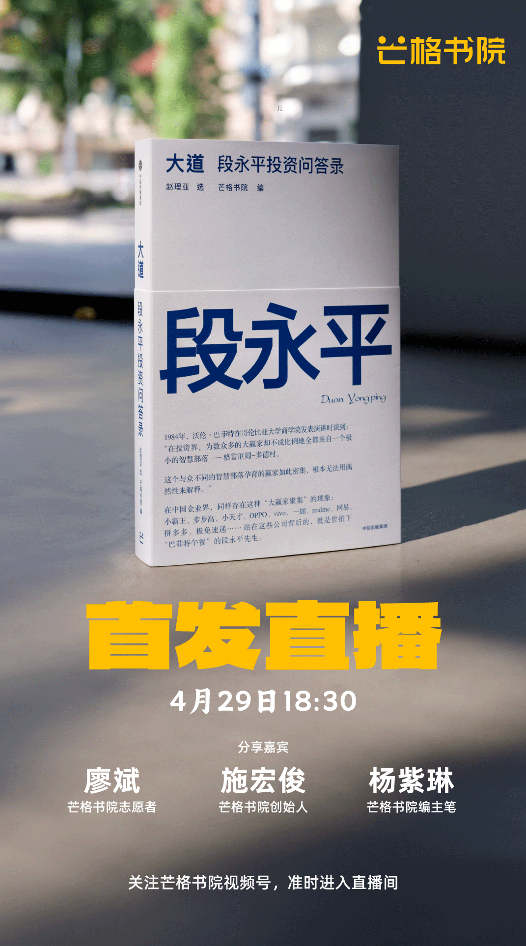 4月29日18:30,芒格书院创始人施宏俊、志愿者廖斌、主笔杨紫琳等同事将一同为大家分享《大道》成书背后的故事,阅读《大道》的门道,以及芒格书院后续传播价值投资理念的设想与计划。