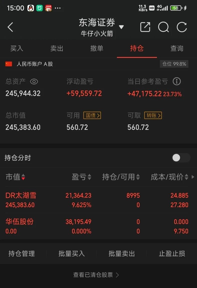 十万组第一名小火箭,今天盈利23%,总成绩101%,好久没有前三看到他了,昨天满仓切换到了创业板连板龙头-军工板块的华伍股份,今天该股高开高走,早盘最高涨了十几厘米,长时间高位振荡,他高抛走人,累计获利3.8万。今天他又满仓出击了北交所太湖雪,收盘大肉9.6%,这是早盘就清仓华伍,然后第一时间低吸太湖雪,成本太低了。