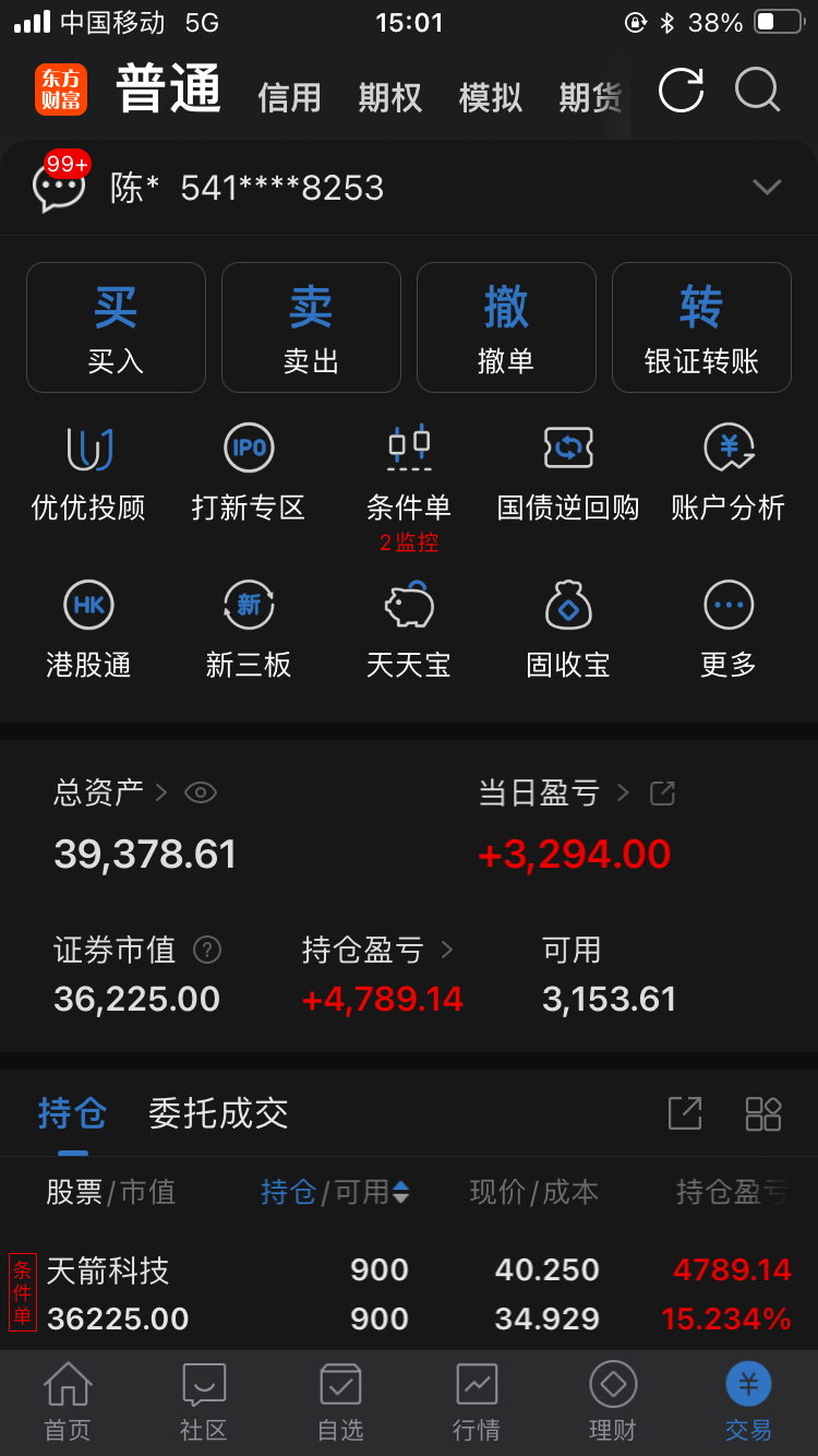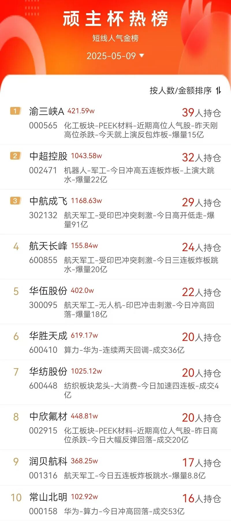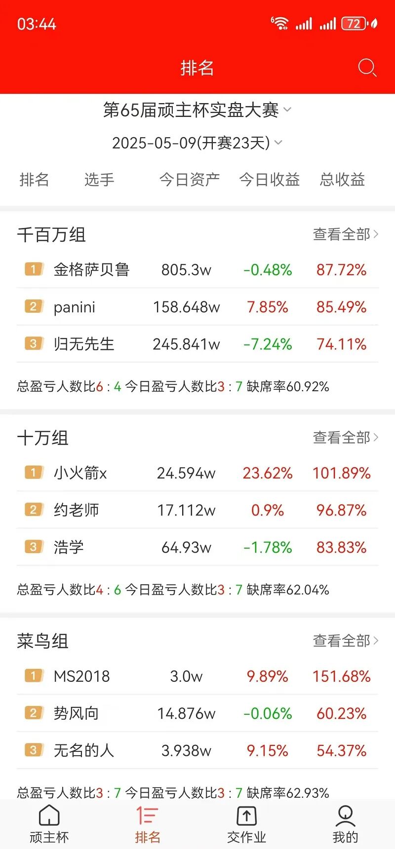 第三名无名的人,今天盈利9%,总成绩54%,今天他坚守军工股天箭科技,没有卖飞。