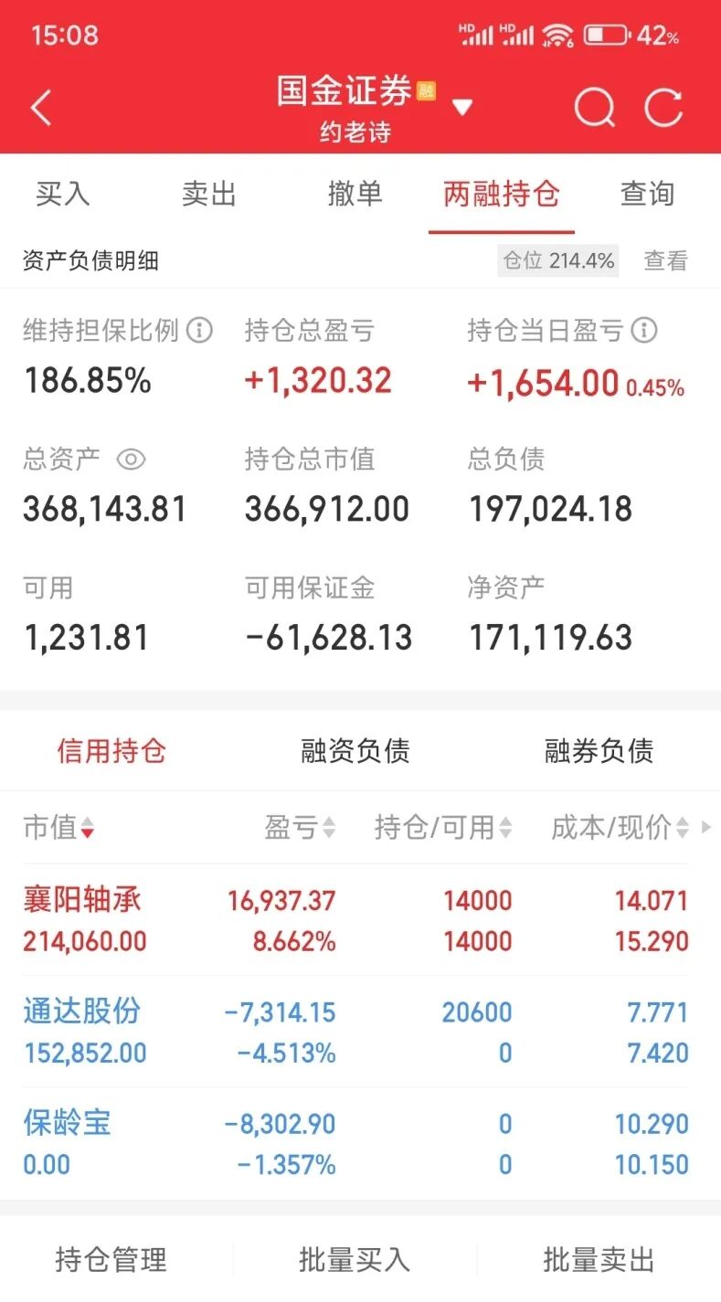 第二名约老师,今天盈利0.9%,总成绩96%,昨天他满仓融资进了机器人概念股襄阳轴承20万,今天盘中多次迎来冲高时刻,他竟然忍住没卖,连T都没有做,目前累计盈利8.6%左右。昨天重仓进了保龄宝,今天小幅止损离场。今天他换仓通达股份15万多,收盘亏了4.5%。