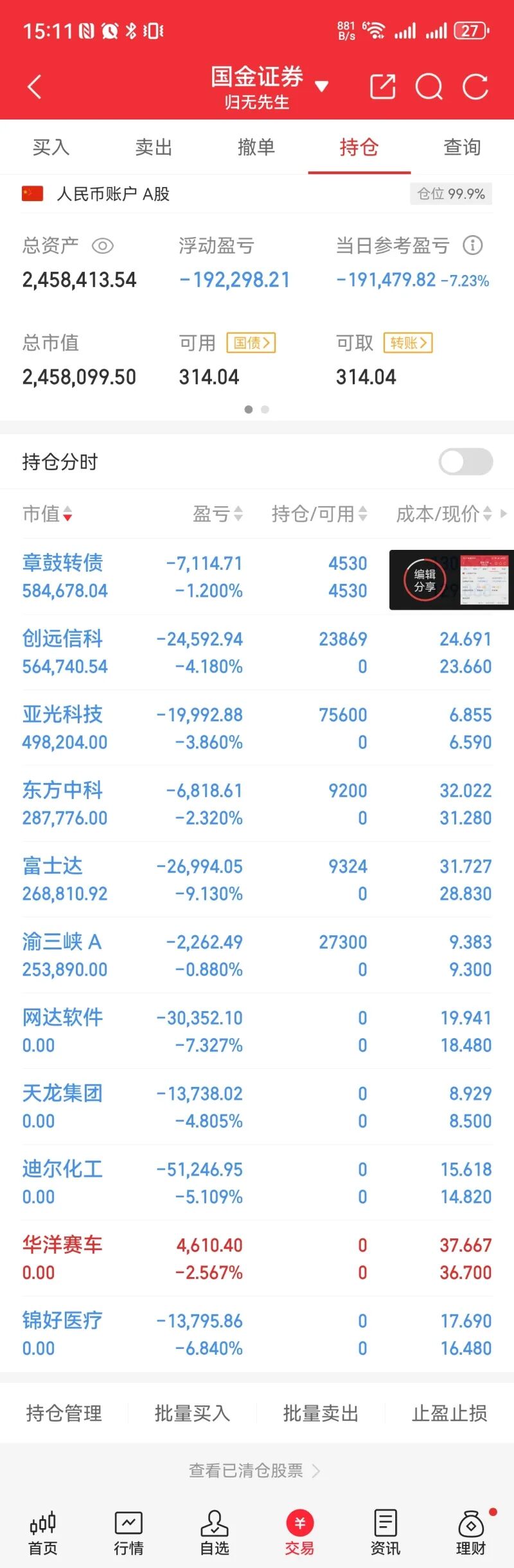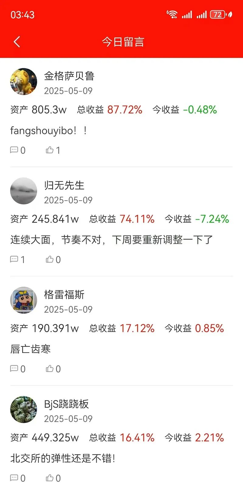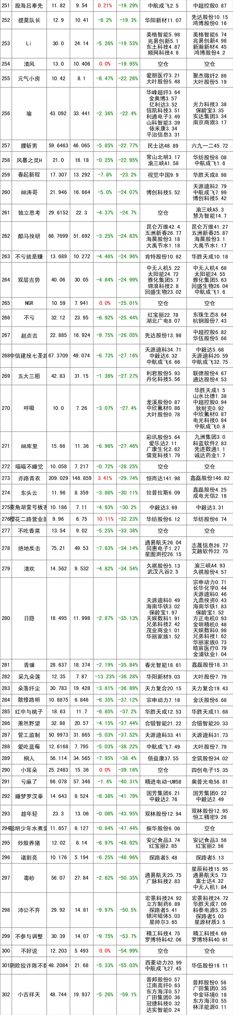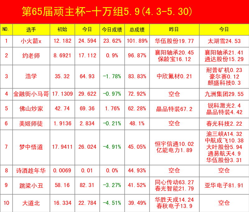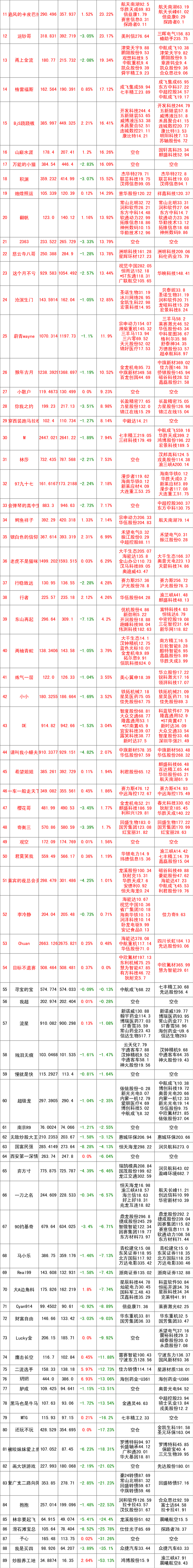 第三名归无先生,今天回撤7%,总成绩74%,今天他的超市又换了一遍货,昨天几个票除了华洋赛车,其余都是割割割,今天新进的几个票都是面面面,这节奏有点不对头,该缓缓。