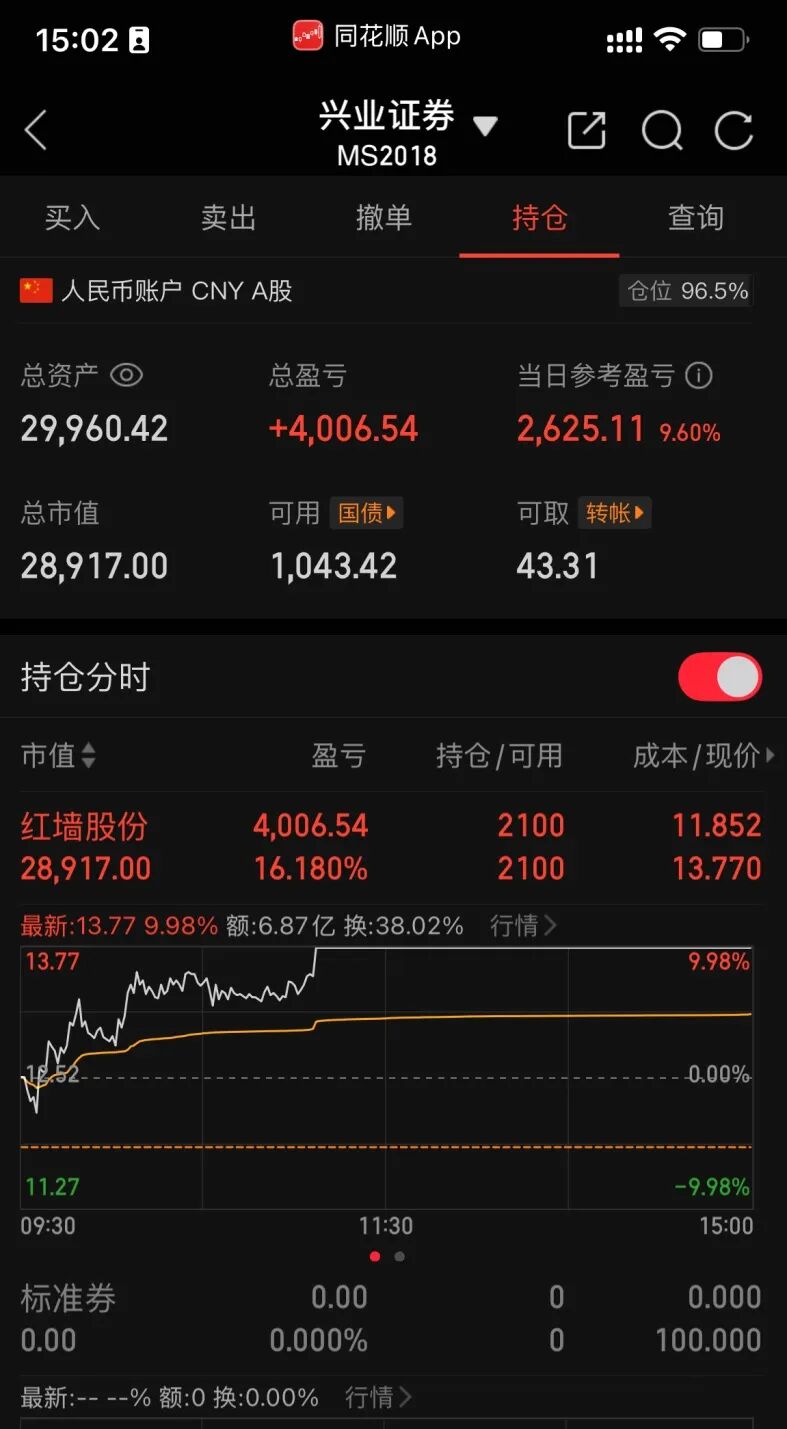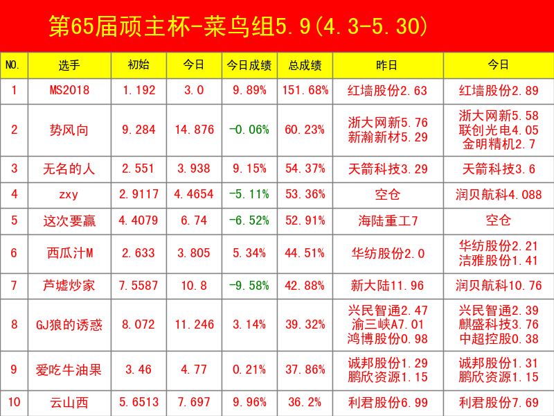 菜鸟组第一名MS2018,今天靠着红墙股份,满仓涨停,总成绩来到了151%,继续领跑三组全体选手,这节奏真是开挂。
