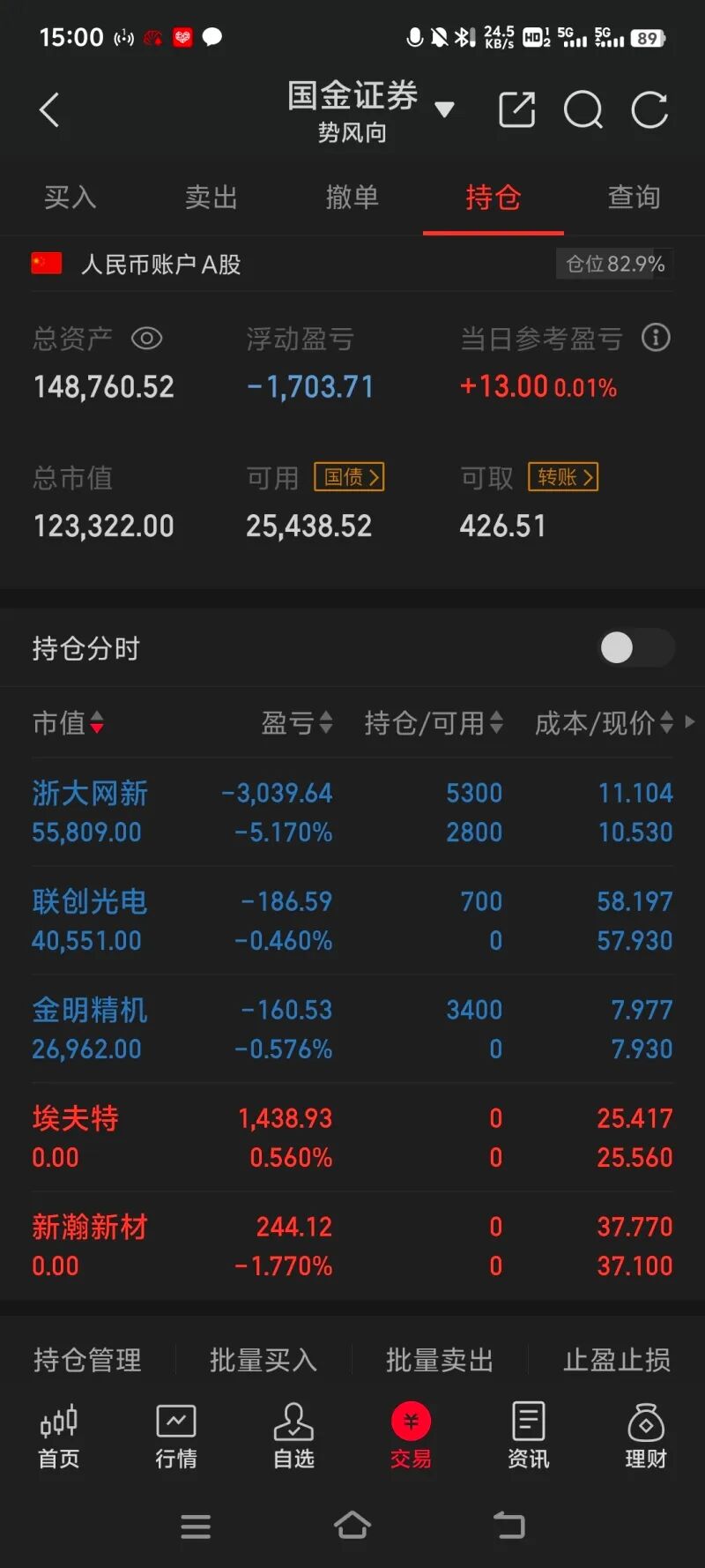 第二名趋风向,今天保本,总成绩60%,今天他坚守浙大网新,清仓新瀚新材,新进了联创光电与金明精机。
