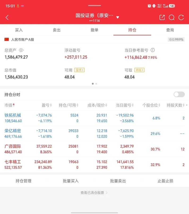 第二名panini,今天盈利7.8%,总成绩85%,昨天他半路追涨了北交所30厘米首板股:七丰精工,当天就吃到了大肉,今天该股盘中一度30厘米二连板,尾盘炸板,收盘仍大涨了17%,他没有浪费做T机会,高抛低吸,收盘仍持有52万左右,累计收益达23万之多,不愧为北交所专业户。昨天他还拿了铁拓机械54万,今天平开低走,不及预期,他把仓位减到了10万左右。老情人广咨国际,他今天杀回马枪,加到了48万左右。今天唯一新进对象是下午追涨了荣亿精密47万多,收盘小亏。