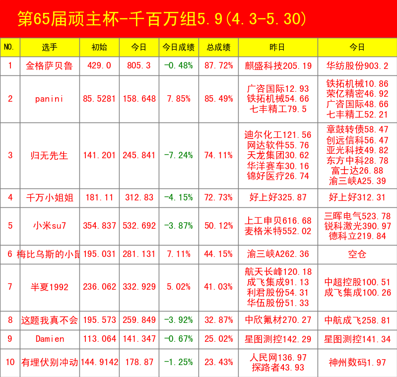 千百万组第一名金格萨贝鲁,今天微亏0.48%,总成绩87%左右,昨天他只小仓留守了新生代连板股-人脑工程概念的麒盛科技,今天该股低开高走,盘中两度冲击涨停,实现四连板,他大概率开盘就清仓走人,卖在全天最低价附近。不然怎么在早盘开板瞬间,满仓融资903万,抢板新生代四连板-纺织股龙头:华纺股份,真是电光火石之间,决胜千里之外。今天纺织板块好几个华字辈都被华纺带起来了。