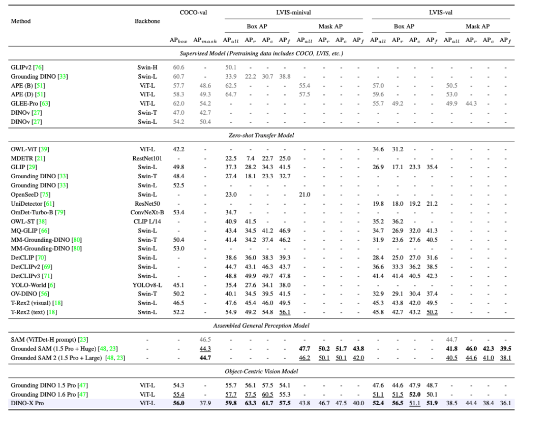 相对于主流开集模型,DINO-X 的检测性能达到了新的 SOTA。如图 3 所示,在 COCO 目标检测基准测试中,DINO-X 边界框平均精度(box AP)达到了 56.0。而在 LVIS-minival 和 LVIS-val 基准测试中,DINO-X 的边界框平均精度分别达到了 59.8 和 52.4,比 Grounding DINO、YOLO-World 等开源模型平均高出 10 几个 AP。值得注意的是,在 LVIS 稀有类别目标的检测性能方面,DINO-X 在 LVIS-minival 上达到了 63.3 的 AP,在 LVIS-val 上达到了 56.5 的 AP,这意味着DINO-X 在长尾目标识别更精确。