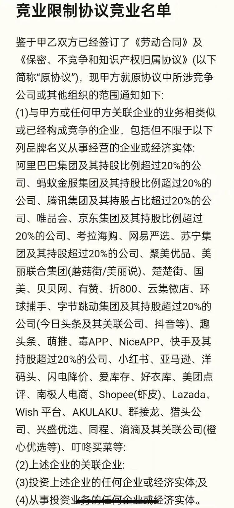 另一方面,竞业协议中友商的限制范围也变得越来越广。刘永晓看过不少头部大厂的竞业协议,一个深刻印象是,它们的竞业名单基本都很长。