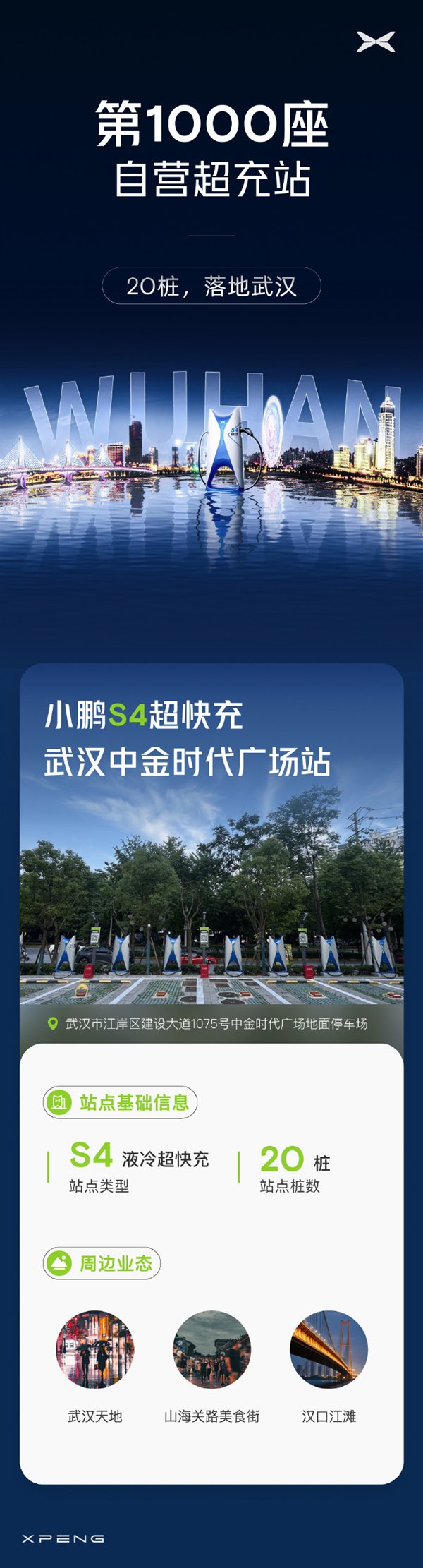 🎉 **里程碑式突破:** 小鹏汽车的第1000座自营超充站正式投入使用,标志着其充电网络建设迈入新的里程碑。该站位于武汉,配备20个S4液冷超快充桩,能够在3公里范围内为超过1000名小鹏车主提供服务。