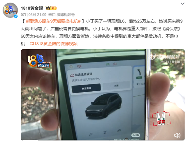 理想L6车主小丁在提车9天后遭遇车辆故障,经理想汽车检测确认需更换后电机。小丁要求退换车辆,但理想方面认为电机不应等同于发动机,不符合退换车条件。事件引发网友热议,也引发了对新能源汽车“三包”政策的讨论。