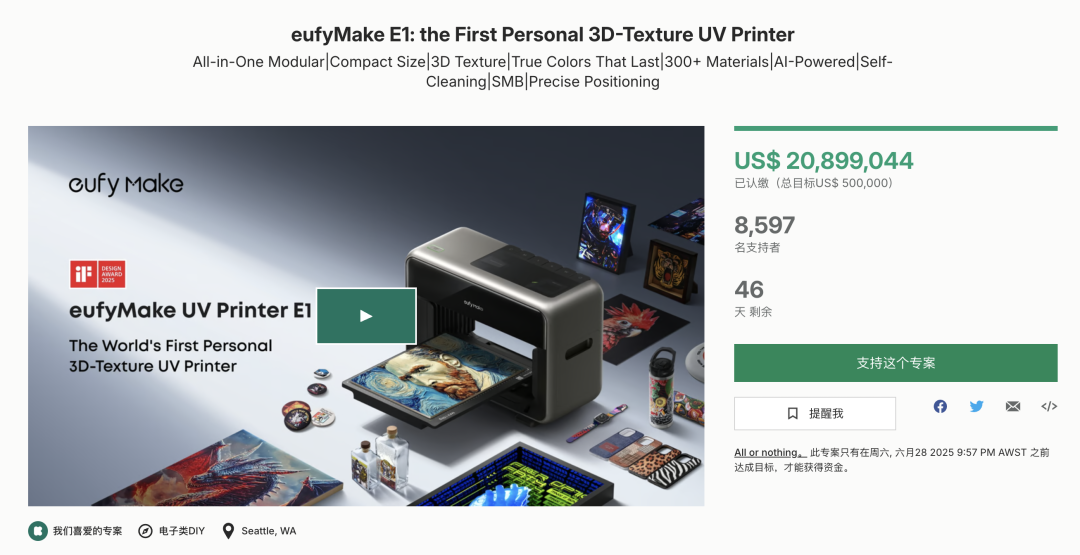 2025 年 4 月 30 日,安克创新旗下品牌 eufyMake 的全球首款个人级 3D 纹理 UV 打印机 E1,在 Kickstarter 上线不到 12 小时,众筹金额突破 1000 万美元。