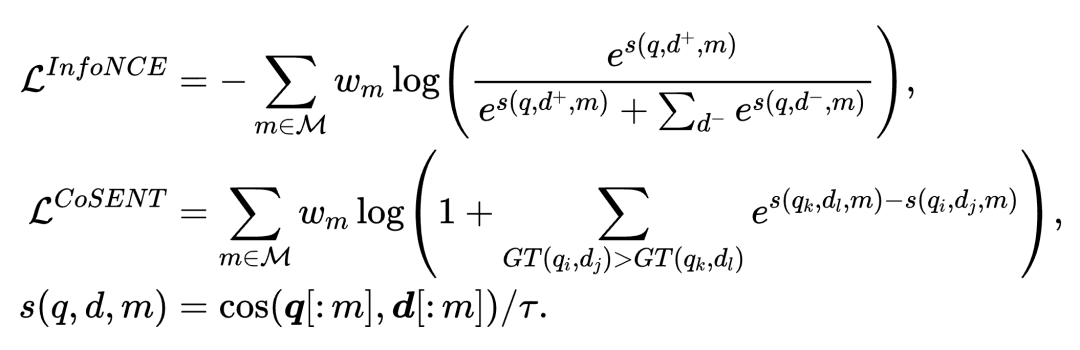 为了支持下游任务中不同尺寸的向量(维度 M = {256,512,1024,2048})使用场景,团队对效果和存储开销进行权衡,使用了 MRL 优化 InfoNCE loss 和 CoSENT loss,在一个高维向量中嵌套多个低维向量,减少嵌入向量大小同时,保持性能,具体形式如下: