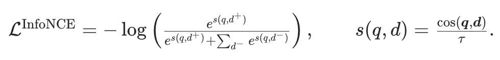 这些数据形式均为(查询文本,相关文本)对,包含网页标题-段落,QA 平台问题-答案,论文标题-摘要等各种形式。我们使用标准的 InfoNCE loss: