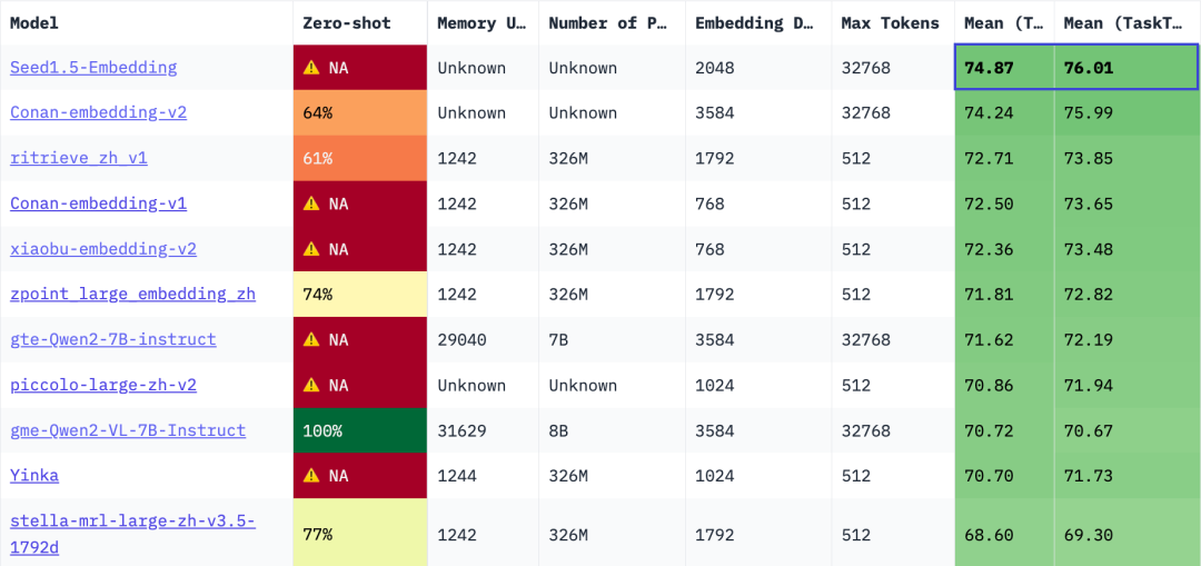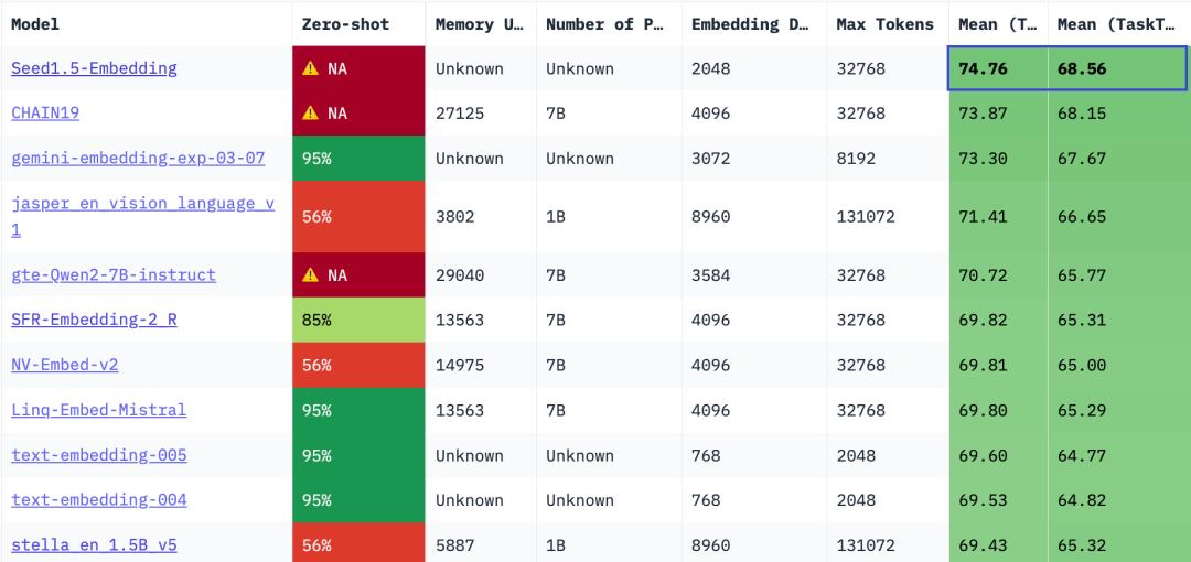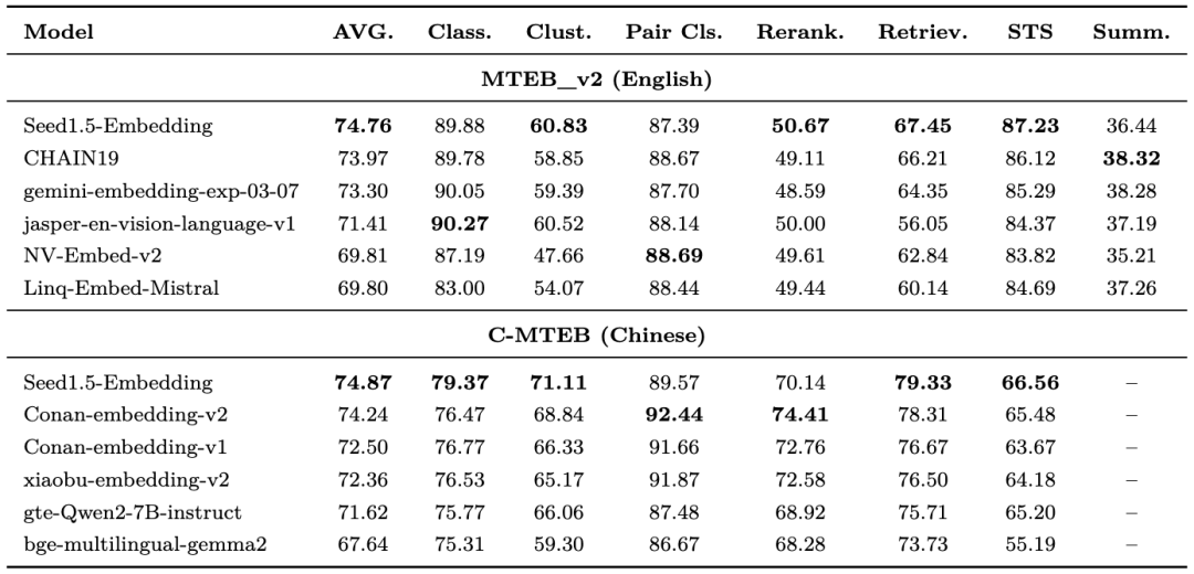 测试结果显示,Seed1.5-Embedding 在MTEB榜单中英文任务上超过 gemini-embedding、Conan-embedding-v2 等业界具有代表性的向量模型,证明了其通用能力。