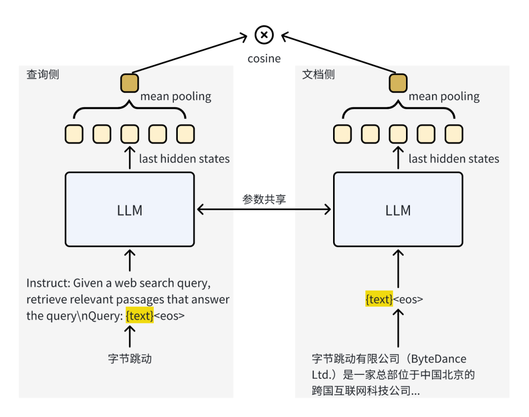 在模型结构上,团队使用 Siamese 双塔向量模型结构,取所有 token 表示的平均作为最终文本向量,查询与文档之间通过 cosine 相似度计算匹配得分。其依托 Seed1.5 预训练 LLM,并将单向注意力改为双向,构建出一个小规模 MoE 模型,且查询侧和文档侧模型参数共享,保证了较高的运行效率。