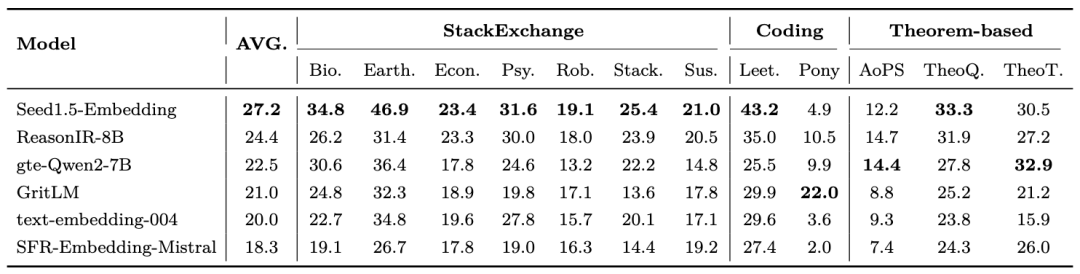 通用任务之外,Seed1.5-Embedding 在推理密集型检索 BRIGHT 榜单上也超过其他同类模型,并且在 Biology、Earth Science、Coding 等基于 StackExchange 上的复杂搜索上与现有模型拉开显著差距,证明该模型能深入理解查询和文档侧的输入,并建模两者之间复杂的匹配关系。