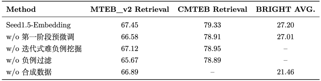 在通用场景下,团队先 prompt Seed1.5 模型根据语料库中文档生成多样化查询,并仅保留相关度较高的查询-文档对。针对保留下来的查询-文档对,团队应用前文提及的负例挖掘方法挖掘难负例。