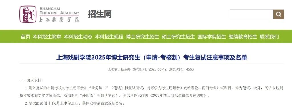 上海戏剧学院官网发布2025年博士研究生(申请-考核制)考生复试名单 官网截图