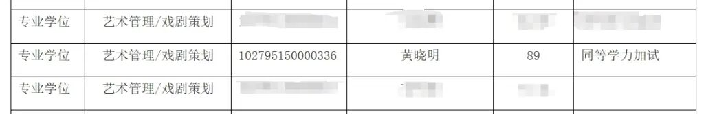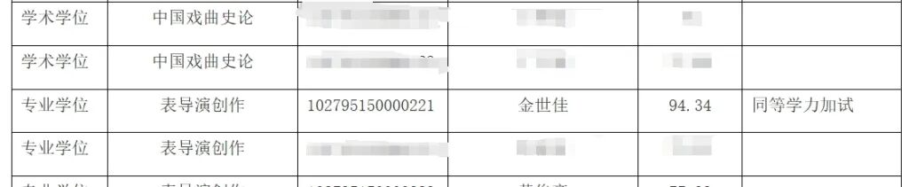 名单显示,黄晓明、金世佳二人申请的均为专业学位,黄晓明报考研究方向是艺术管理/戏剧策划,业务一科目成绩为89分,金世佳报考研究方向为表导演创作,业务一科目成绩为94.34分。