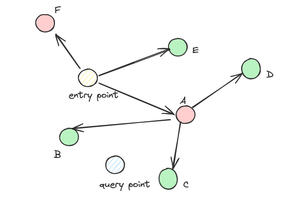 如下图所示,绿色点表示符合过滤条件的向量,红色点表示不符合。若遍历图时跳过红色点 A,那么点 B 和 C(它们与查询点距离很近)可能会因此无法被访问,导致图结构“断连”,形成“孤岛”。