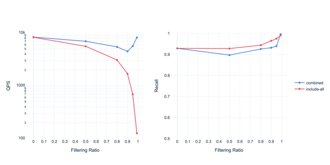 除此之外,当过滤比例极高(如 99% 以上向量都不符合条件)时,图路径会变得极长,孤岛增多,性能大幅下滑。此时系统会自动切换为暴力搜索以提升整体效果。