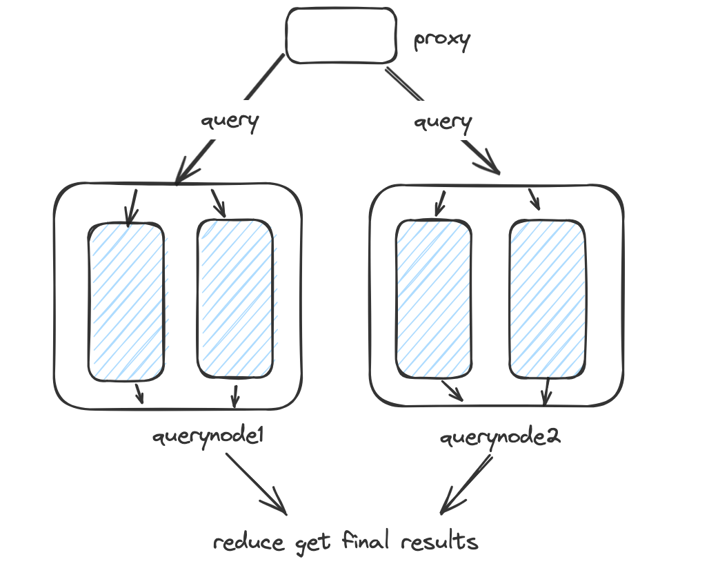 Milvus 查询流程如下:Proxy 将请求分发至多个 QueryNode,每个节点处理对应 Segment 的 局部TopK,最后合并结果。