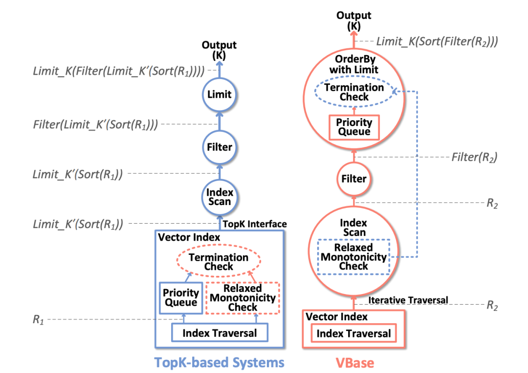为了解决这个问题,受VBase启发,我们引入了 迭代式过滤(Iterative Filtering)。该方法利用向量索引提供的迭代器,逐步返回最近邻结果,每获取一批候选结果就执行一次元数据过滤。