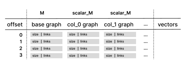 如下图所示,原始图索引被称为 基础图(base graph),而由标量字段生成的子图称为列图(column graphs)。我们同时限制图的出度(out-degree),以平衡内存与性能。当用户的搜索请求中没有元数据过滤时,系统会使用 基础图(base graph)查询;而当指定了元数据过滤条件时,系统会使用与过滤字段对应的列图(column graphs)来加速搜索过程。