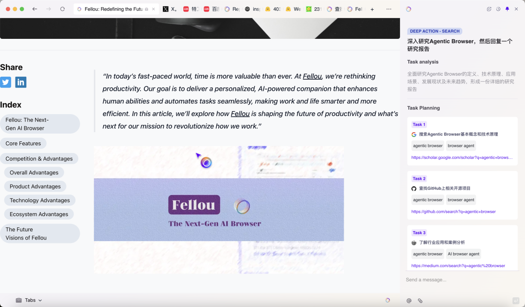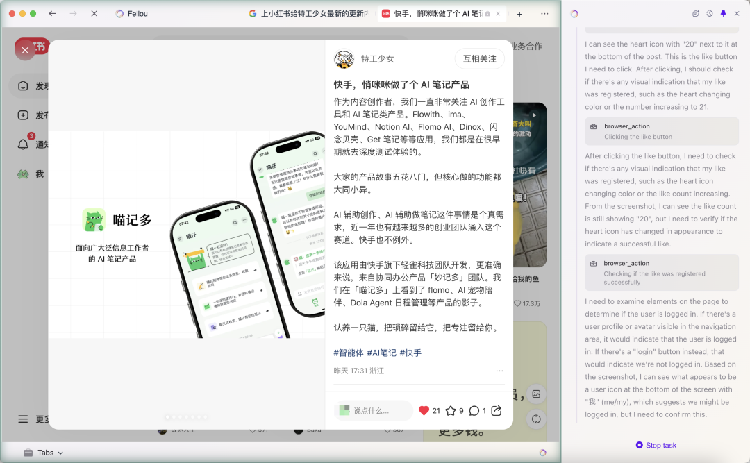 Manus 是全球首个通用 Agent,Genspark 和扣子空间等是这个方向;Fellou 是全球首个 Agentic Browser,Dia 和 Browser Operator 等是这个方向。Manus 团队此前的分享中,有三条结论让我印象深刻。1. AI 浏览器不是在浏览器里加 AI,而是做给 AI 用的浏览器;2. 操作 GUI 不应该抢夺用户的控制权,而是让 AI 有自己的虚拟机;3. Attention 不是 all you need,解放用户的 Attention 才能重新定义 DAU。Manus 专注的是做 Agent 本身,做浏览器不过也只是为了给 Agent 配了个工具,本质上是为了让 Agent 更好的完成任务,正如官网 slogan 所说:“在你安心休息的同时,一切都能妥善完成。”Manus 和 Fellou 都做了 Browser、Agent、Workflow 这几件事情,其中 Manus 把 Browser 和 Workflow 作为 Agent 执行 Action 的工具。而 Fellou 的产品故事会更宏大一些,做的是下一代智能的浏览器,更准确的说,是基于浏览器的全新系统。更详细来说,是融合了各种 Agent 和 Workflow 的 AI 能力,构建于浏览器之上的人机协同的新环境。全球每个月有超过 50 亿人在使用浏览器,并且深入我们生活各处。我们很难去颠覆掉这种用户习惯,但可以用 AI 去重塑浏览器,Fellou 做的就是这样一件事情。最近看到一些人吹捧 Dia 浏览器,着实觉得有些尴尬。我们在 Dia 刚刚内测时就进行了体验,现在版本功能跟装个 Monica 插件体验差距不大,产品完成度不如豆包浏览器。不是说 Dia 不好,而官网视频里介绍的真正厉害的 Agentic 功能,还只是期货没有上线。但 Fellou 先做了出来。在侧边栏 Agent 会进行任务拆解和规划,待你确认后即可进行并行批量搜索,大大加快了研究速度,并且可生成可共享的可视化报告网页。其中 Fellou 研发了一个 Shadow window(影子窗口),即给 Agent 的虚拟工作环境。在 Search 任务下触发,不会影响用户其他操作。Deep Search 功能比较常规,但得益于 Shadow window,Fellou 既可以像 Genspark 那样快速的并行搜索,又能像 Manus 那样访问许多需要登陆网站账号才能进行的操作。Fellou 做了 GUI Agent,可以自动规划任务、调用工具并执行操作,从而协调多个 Web 界面内功能,实现各种浏览器内的任务。包括购物、预约会议、发送电子邮件和发布文章等。比如让它上小红书给「特工少女」最近的更新内容点个赞,Fellou 精准的实现了这一需求。此外,Fellou 官方还给出了许多 showcase,包括打开亚马逊将商品添加到购物车、打开 Linkedin 发布文章等等。https://fellou.ai/blog/post/fellou-introduction/3. 智能感知浏览器环境Fellou 可以在对话过程中自动识别打开的网页作为上下文。还允许用户通过@标记来比较和分析多个网页。此外,用户可以将图片直接拖放到聊天窗口中,无需复制粘贴,从而实现无缝交互。4. 支持异步操作Fellou Agent 执行分配的任务时,用户可以在底部切换标签组以继续处理其他任务。首先,上手门槛还挺高的,对于从来没用过 AI 浏览器的用户来说肯定是懵的。什么时候会操作影子空间?什么时候会调用本地浏览器?什么时候会基于现有网页内容来回答?很多功能我们也是体验了很久才摸清。Fellou 不能像 Dia 一样无缝同步现有浏览器的 Cookie 数据,各个网站还需要手动登录有些麻烦。此外,Fellou 能力很强,就是很多任务执行的很慢...Agentic Browser 用户体验不佳?现在下结论还为时尚早。事实上,Fellou 做的 GUI Agent 已经是行业领先水平,此前开源的 Eko 框架也是在业内饱受好评。整一个 Agentic Browser 的发展还处于早期,与其急于评判,不如共同期待这场浏览器范式转变中的更多可能。无论是 Fellou 还是 Dia,官方都已经预告了后续更加智能的能力,可以一起期待一下。