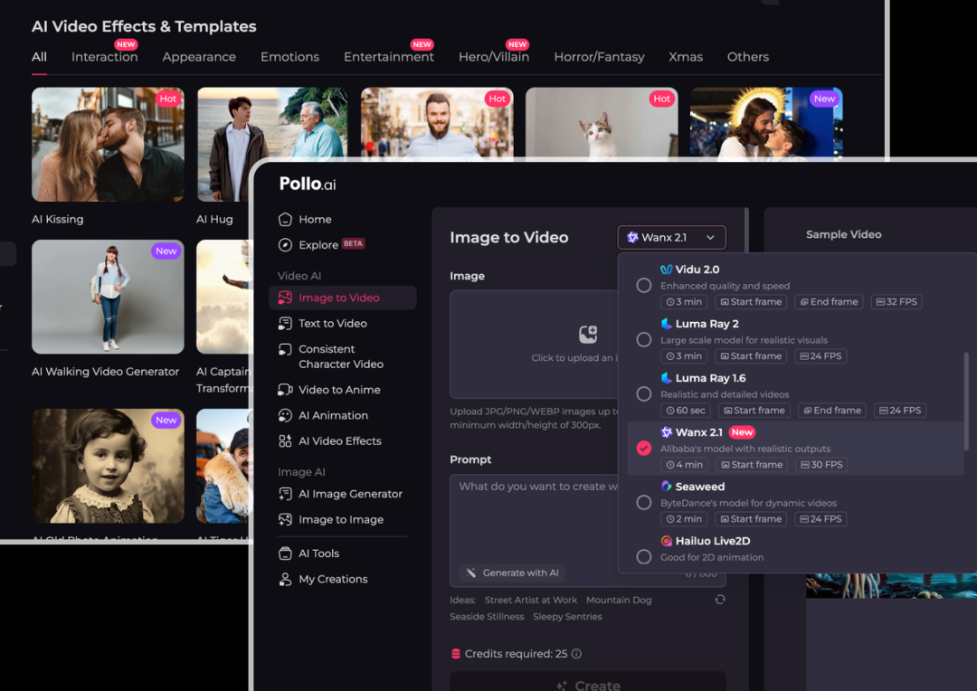 大家如果想体验Wan的话可以考虑选择一些云端All in one平台,可以避免自己本地部署开源模型的麻烦,生成速度也更快。这里给大家推荐一款华人团队的产品Pollo,集成了最新的AI视频、图像生成工具。套餐支持梯度定价,可选择性非常高。