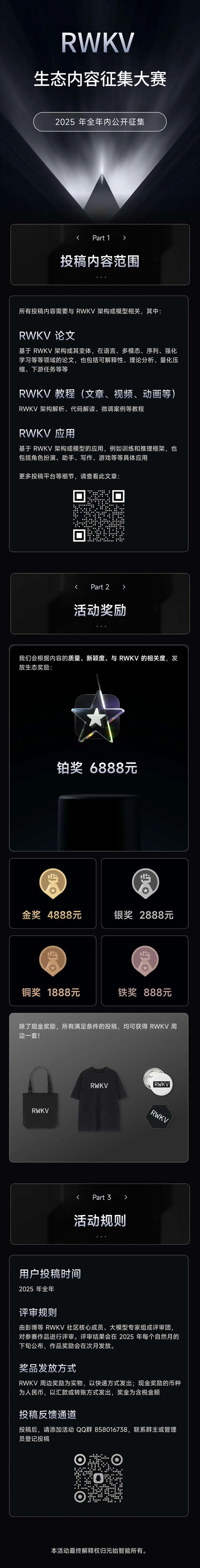 大家好,我们在 2024 年底推出了 “RWKV 2025 生态内容征集大赛”,公开征集 RWKV 相关的作品,包括但不限于 RWKV 相关的论文、讲解 RWKV 的教程,以及基于 RWKV 的应用等。