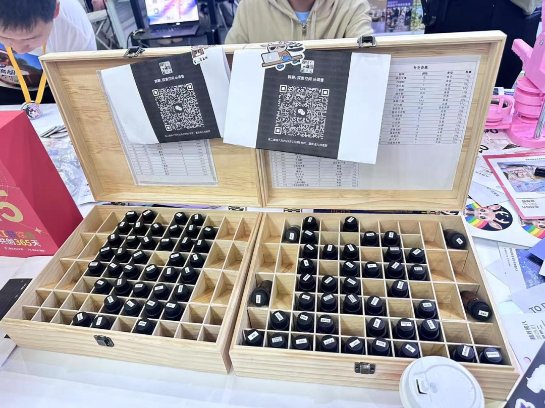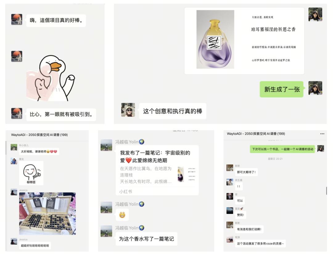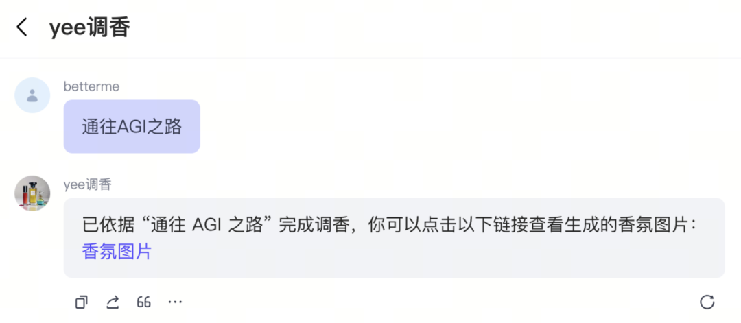 在2050展区上, 做了一个AI调香应用, 只要说一句话, 就可以生成一张香水卡, 会根据输入内容, 来对应到不同的情绪, 生成配方, 比如输入“通往AGI之路”