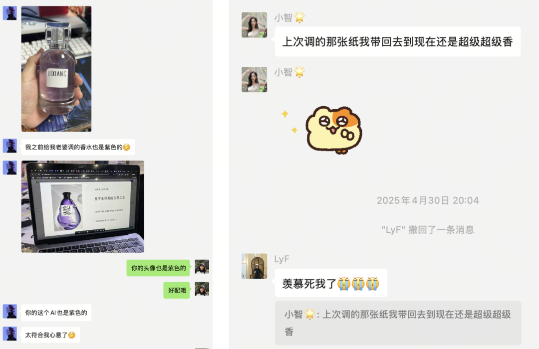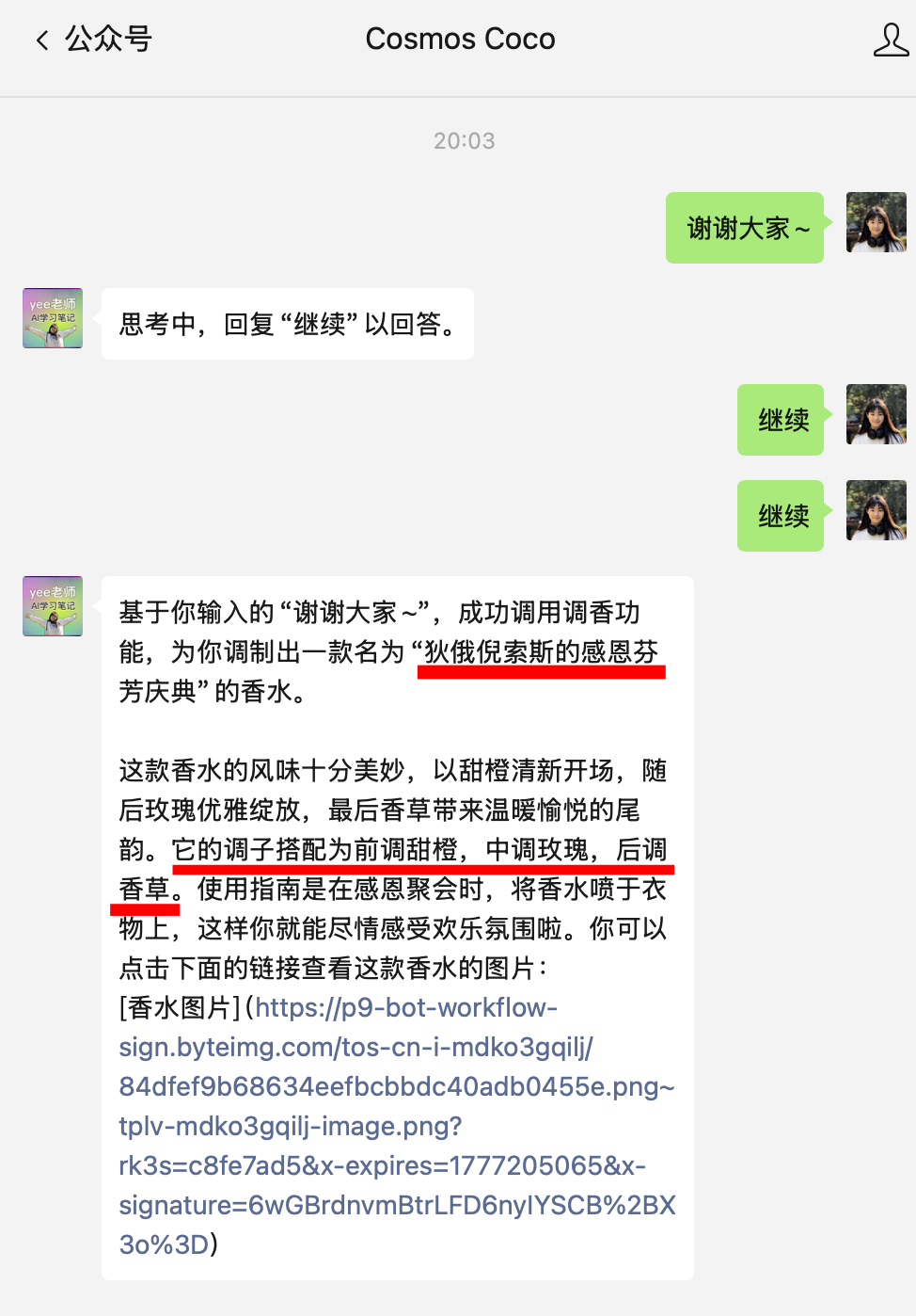 我会持续优化AI调香产品, 争取能让大家线上多体验, 线下能够拿到, 欢迎意见建议反馈, 我的微信公众号也接入了coze工作流, 体验AI调香, 可以直接关注我的微信号后台输入