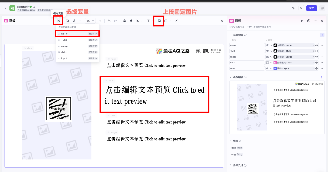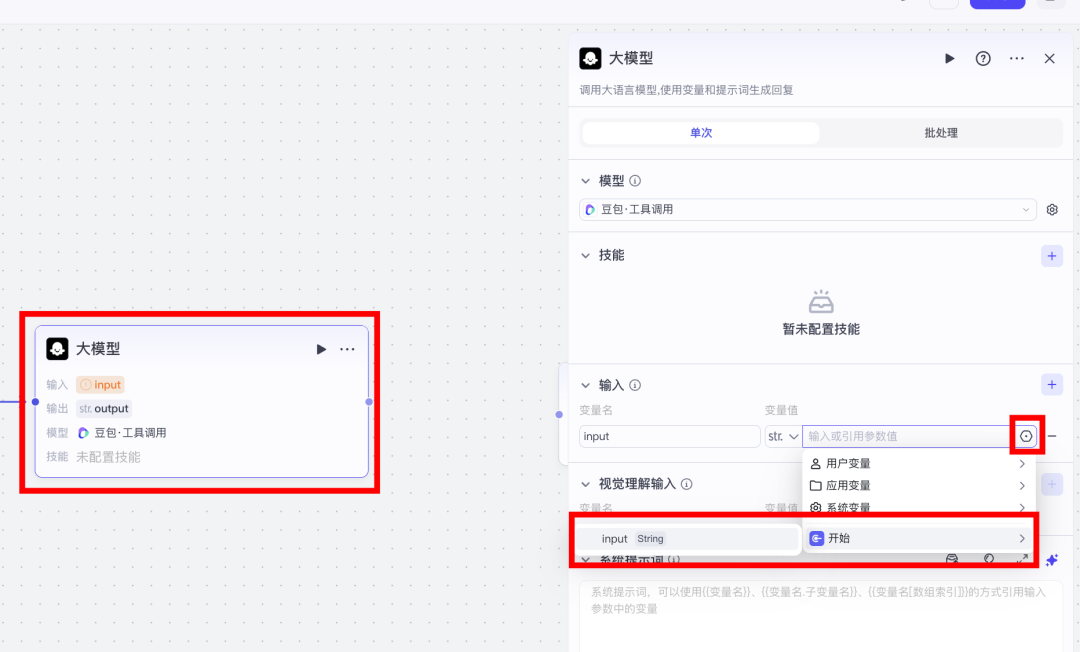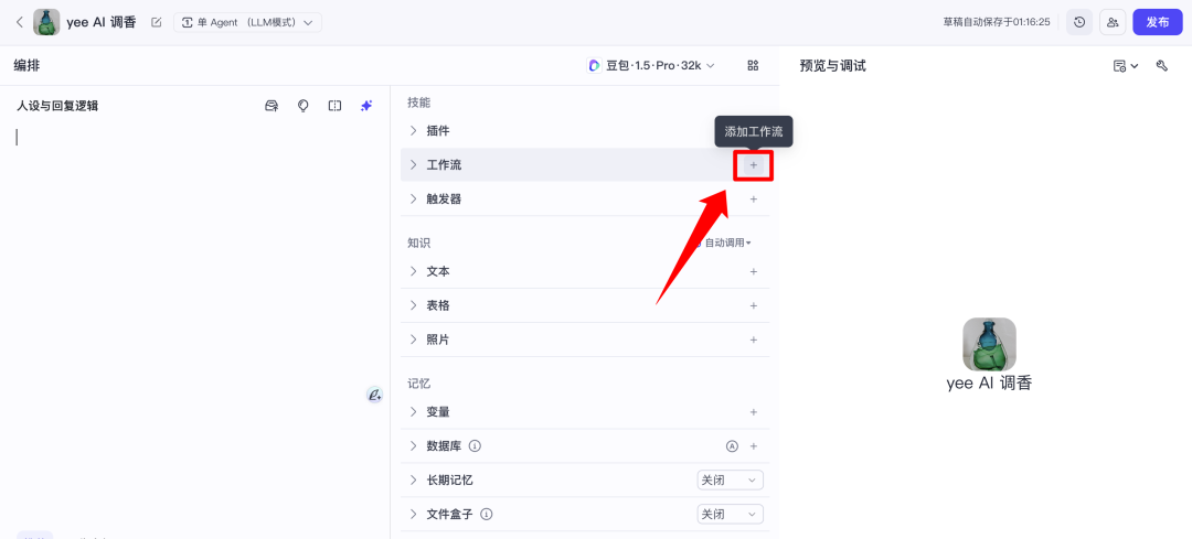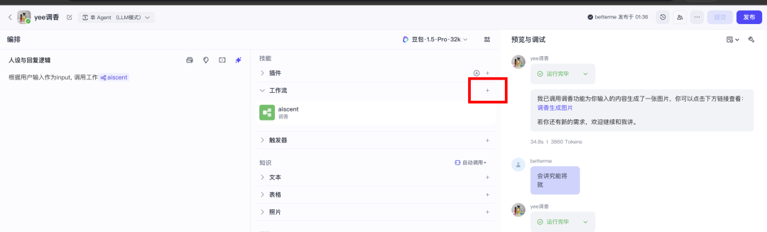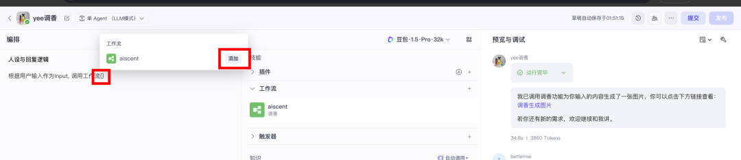 在左边 [人设与回复逻辑] 里, 加入根据用户输入作为input, 调用工作流{, 选择工作流