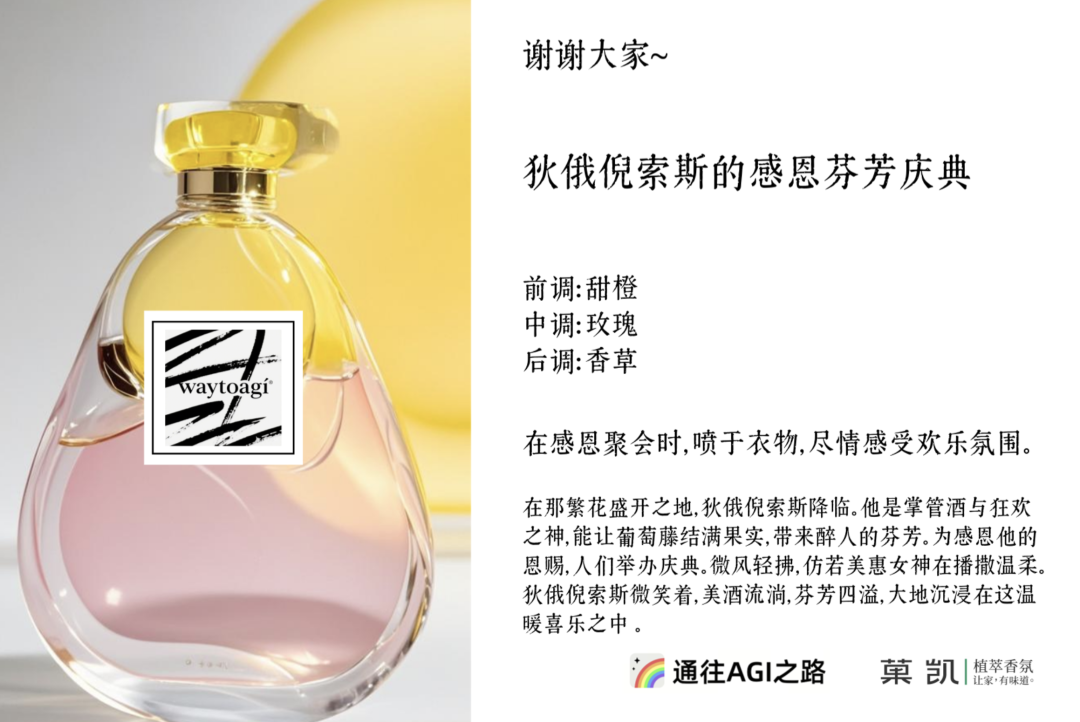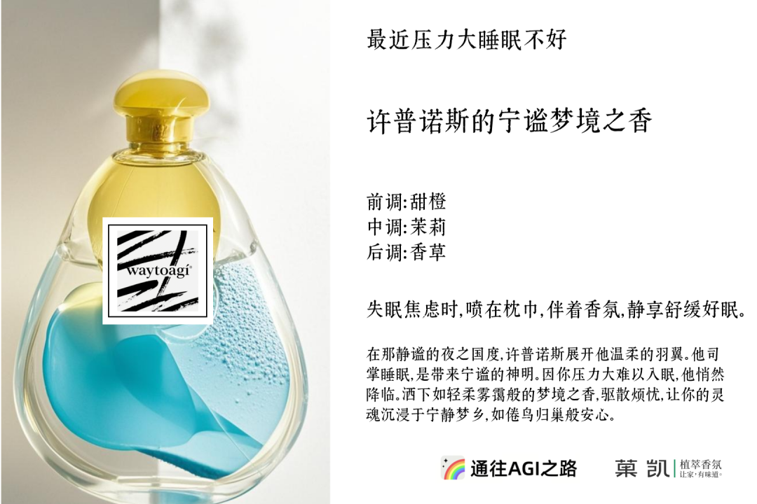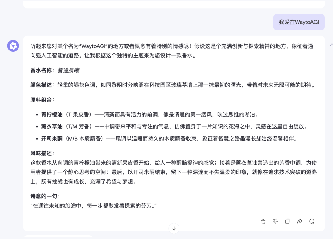 随便输入一句话: 比如“我爱WaytoAGI”, 就可以调出“智途晨曦”香水, 配方为青柠檬油, 薰衣草, 开司米酮