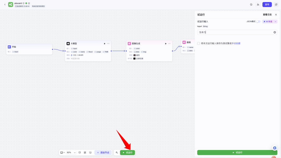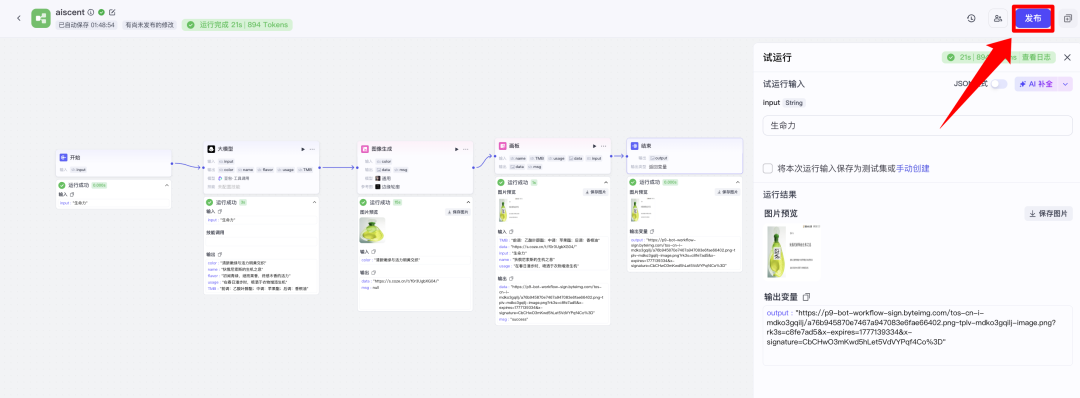 成功后, 可以点击右上角发布, 可以看到只需要21秒就可以生成一个图