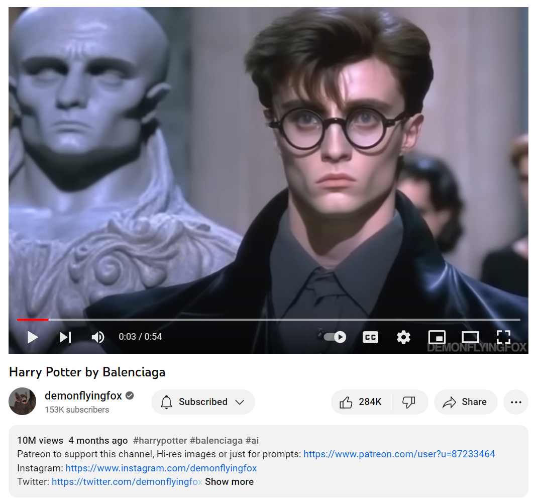 Runway Gen-1 [1] 就是建立在风格迁移的基础之上的工具,提供原视频 + 参考图,就可以生成一个针对该参考图的新的视频。Karen X.Cheng 在她的 twitter 账户上分享了很多自己的测试 [2]