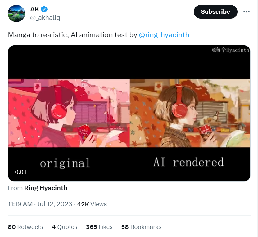 嗨!我是海辛,最近在尝试用 AI 将写实视频风格化,上面做的这个效果在 DY 拿到了 17 万喜欢和 1.8 万评。很多朋友希望我能分享是怎么做的,刚好最近一直在探索将 AI 用于动画制作的生产,积累了许多 demo,决定趁机做一个梳理总结。